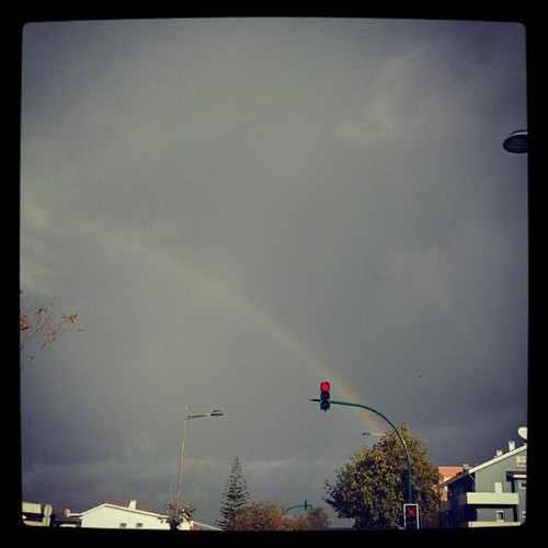 Era um arco-íris perfeito. Fiquei feliz. Num semáforo, tirei uma fotografia com o telemóvel. Mais a frente, quis parar e ficar uns instantes junto ao mar, contemplando o arco-íris. Mas não parei, começou a chover, pingas grossas e pesadas. Segui em frente com as preocupações normais de uma segunda-feira na cabeça. Mas aquele breve momento perfeito ficou e ficará para sempre na íris da minha memória.
